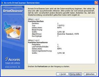 Nach der Auswahl des gewünschten Löschverfahrens löscht Acronis Drive Cleanser alle Datenbereiche sowie Partitionen von Festplatten und formatiert bestehende Partitionen. Darüber hinaus repartitioniert das Programm auf Wunsch die entsprechende Platte schon während des Vernichtens der Daten. Das Ergebnis des gründlichen Saubermanns kann anschließend mit dem so genannten DiskViewer begutachtet werden.