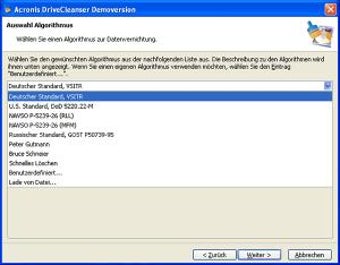 Acronis Drive Cleanser löscht den Inhalt einer Festplatte sicher und unwiederbringlich. Die Shareware nutzt dazu komplizierte Löschalgorithmen. Acronis Drive Cleanser bietet für die Datenvernichtung hochkomplexe Algorithmen, darunter DoD 5220.22-N, VSITR, GOST P50739-95, die Methode nach Peter Gutmann sowie den Löschalgorithmus nach Bruce Schneier. Wem das nicht genügt, der kann dem Drive Cleanser einen selbstgemachten Algorithmus spendieren.
